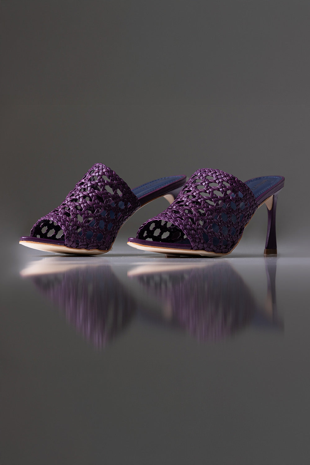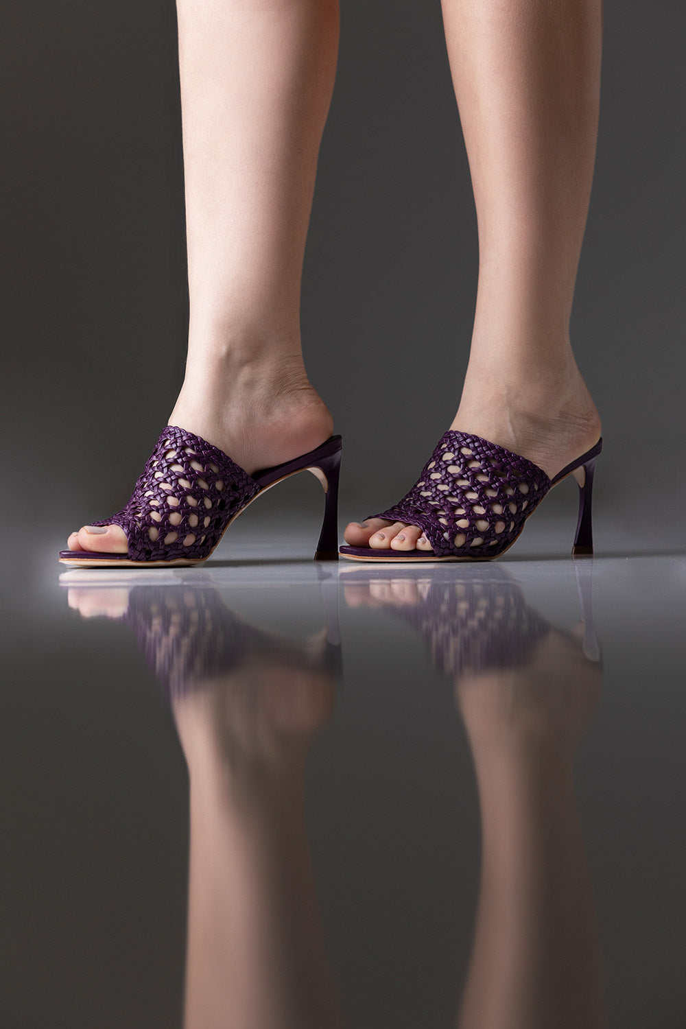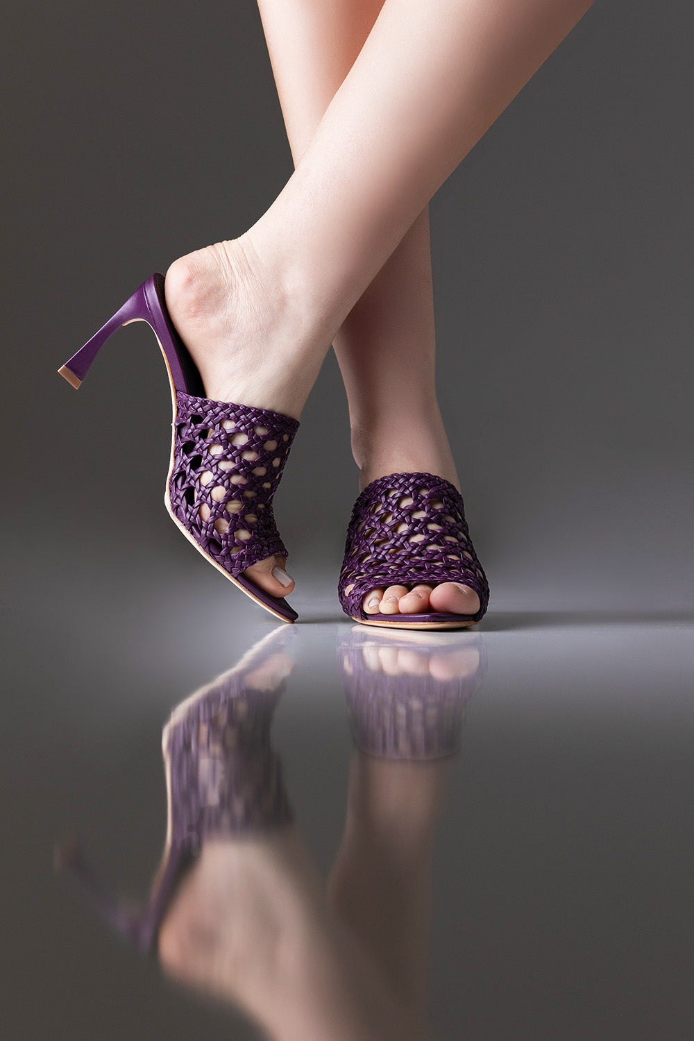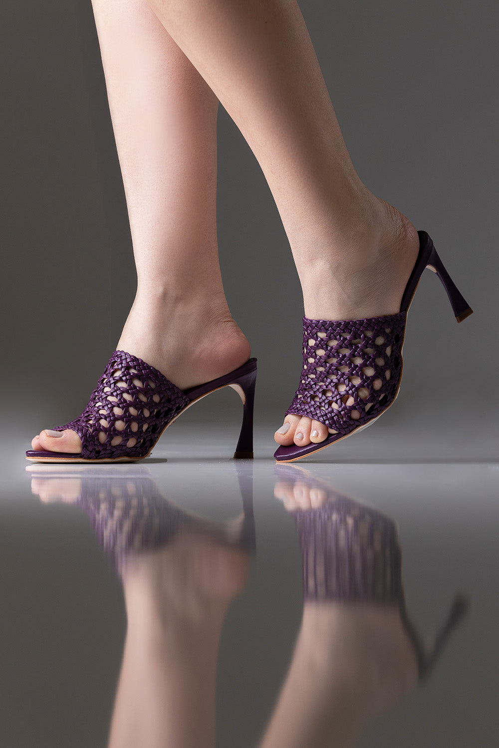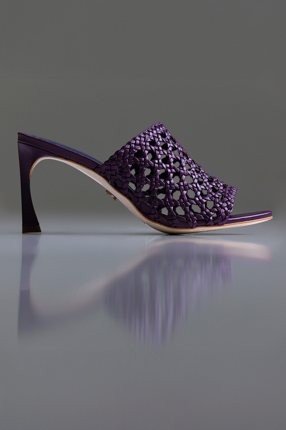 Couro legítimo - cabedal couro púrpura - técnica tressê/ macramê - solado couro natural - salto 8cm