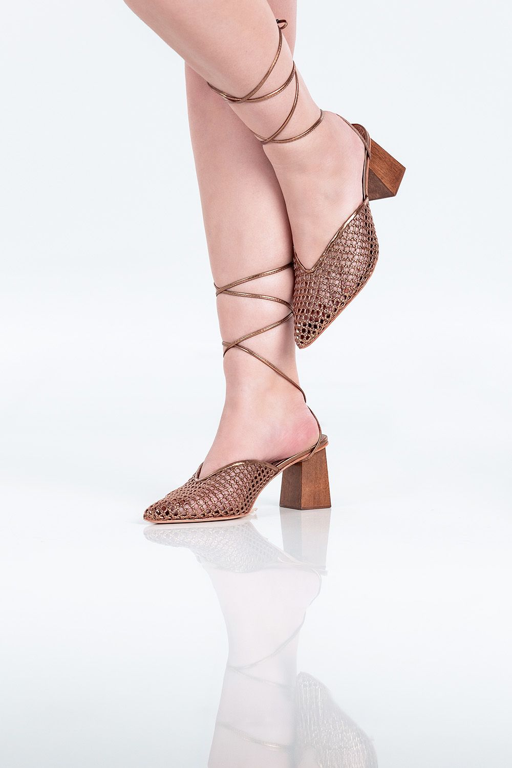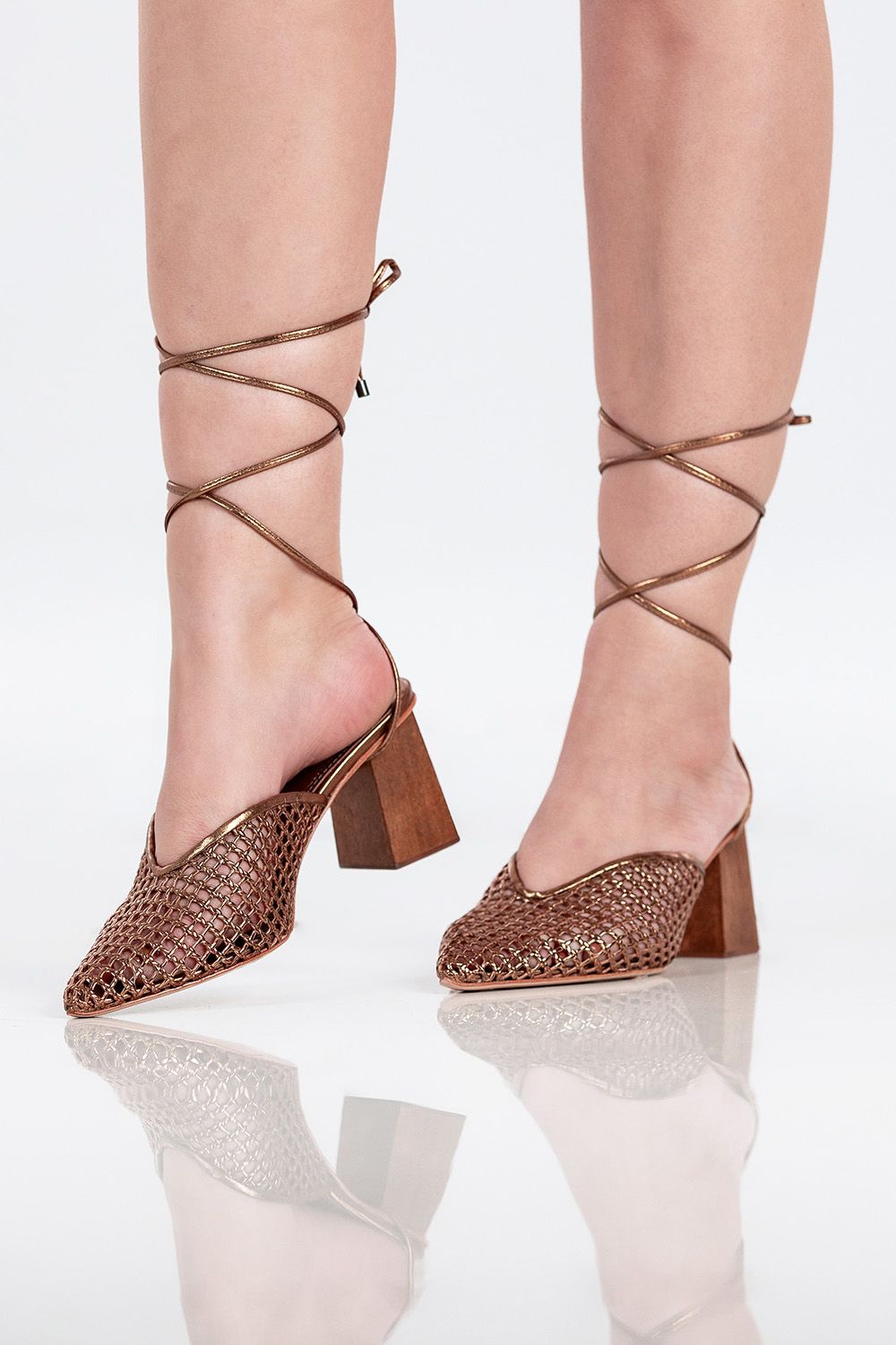 100% couro - amarração removível - cabedal técnica tressê em couro bronze - solado couro natural - salto madeira castanheira - 6cm