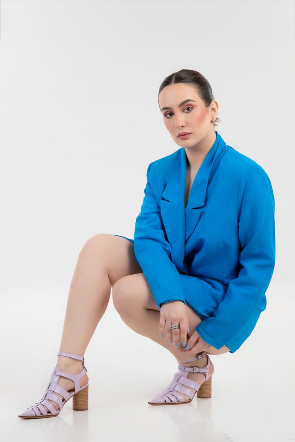O salto bloco de 7cm em fachete natural complementa o visual com leveza e conforto. A madeira clara cria um contraste sofisticado com o cabedal lilás, mantendo a sandália versátil e perfeita para múltiplas combinações.