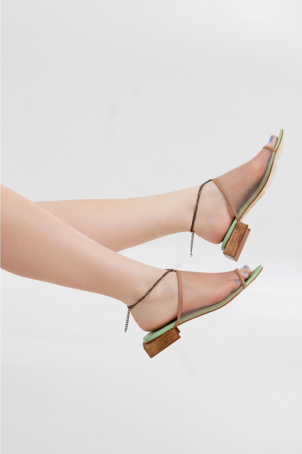 O salto de 2cm em madeira castanheira reforça a naturalidade da peça, enquanto a corrente removível permite transformar o sapato, indo do minimalismo puro a um toque mais ousado com apenas um detalhe.