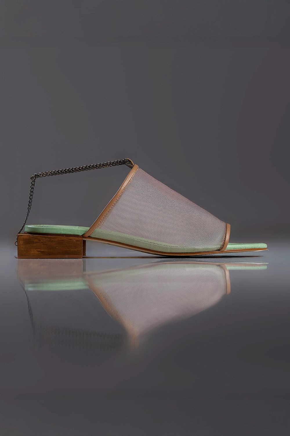 SANDÁLIA ISABELLA - couro tipo croco verde menta/ tela sintética/ salto madeira