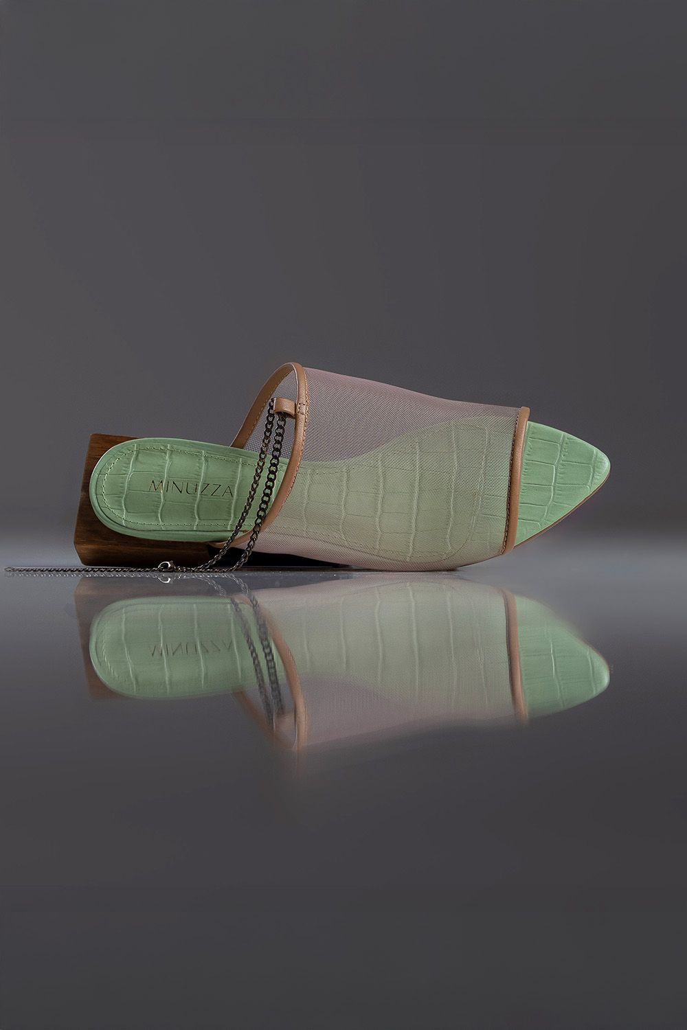 O bico fino, mas sem exagero, alonga a silhueta, enquanto a palmilha em couro tipo croco verde menta  adiciona uma pitada de cor sofisticada e um toque texturizado ao design.