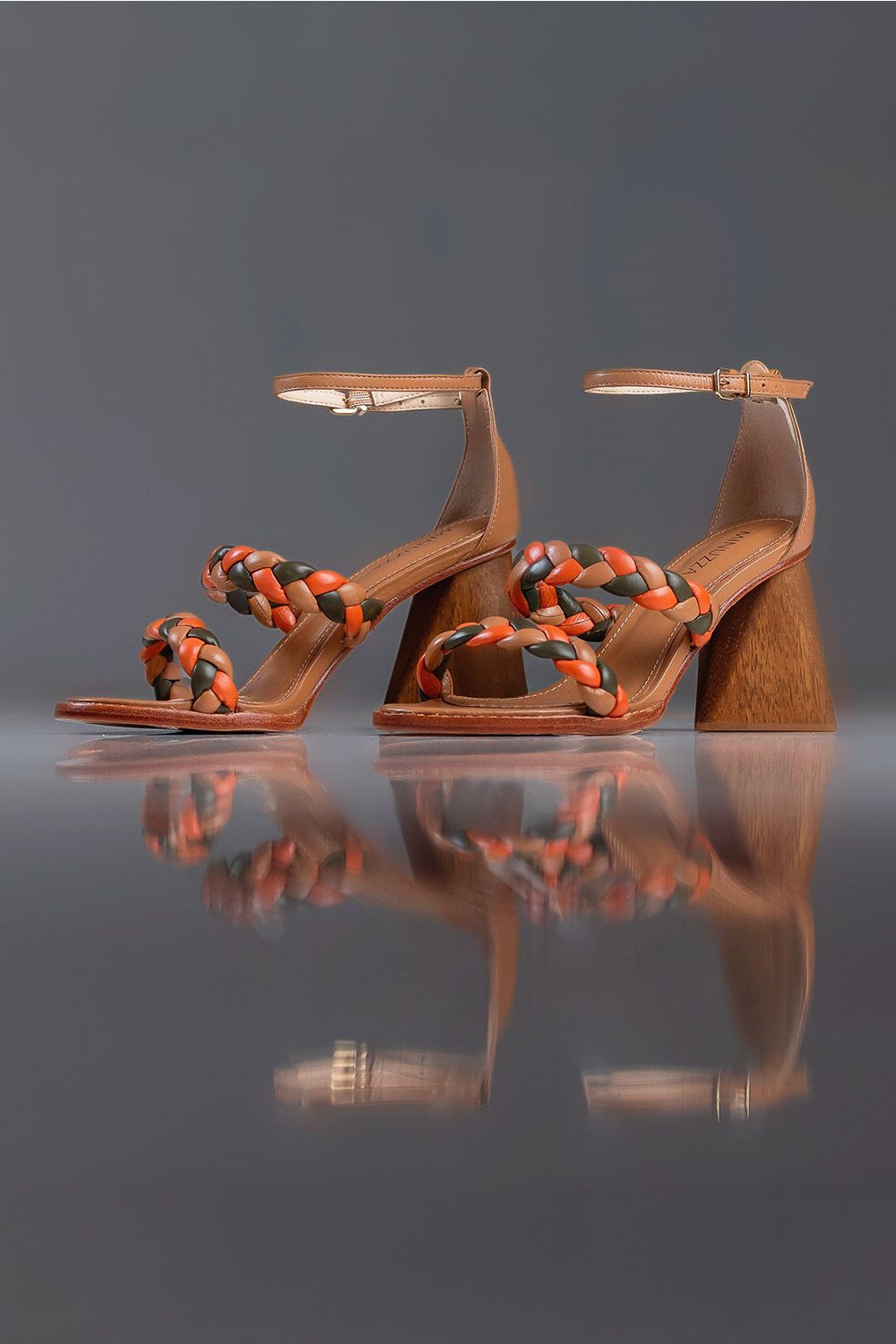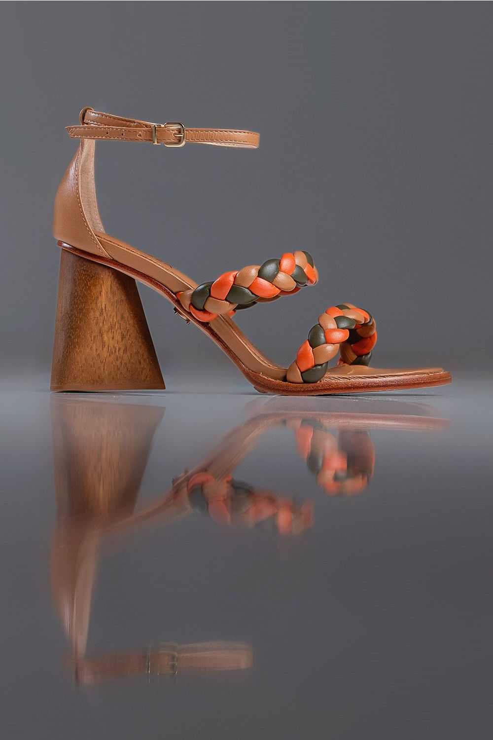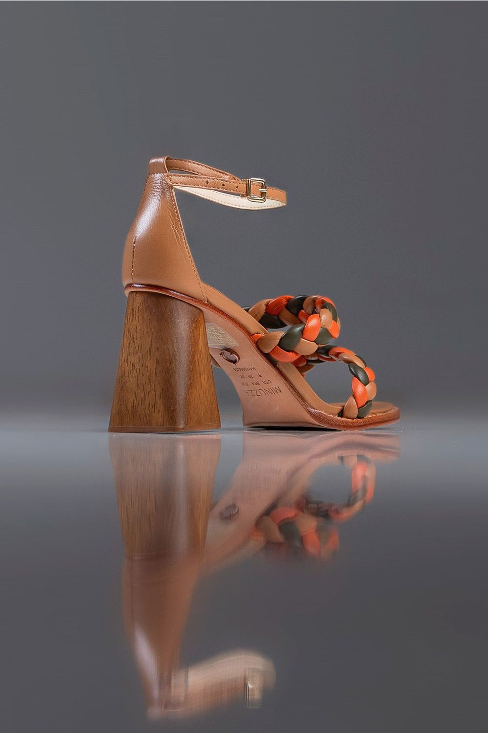 Couro legítimo - base couro caramelo - tranças couro caramelo, laranja e verde musgo - acompanha amarração removível - solado couro natural - salto madeira castanheira - 8cm.