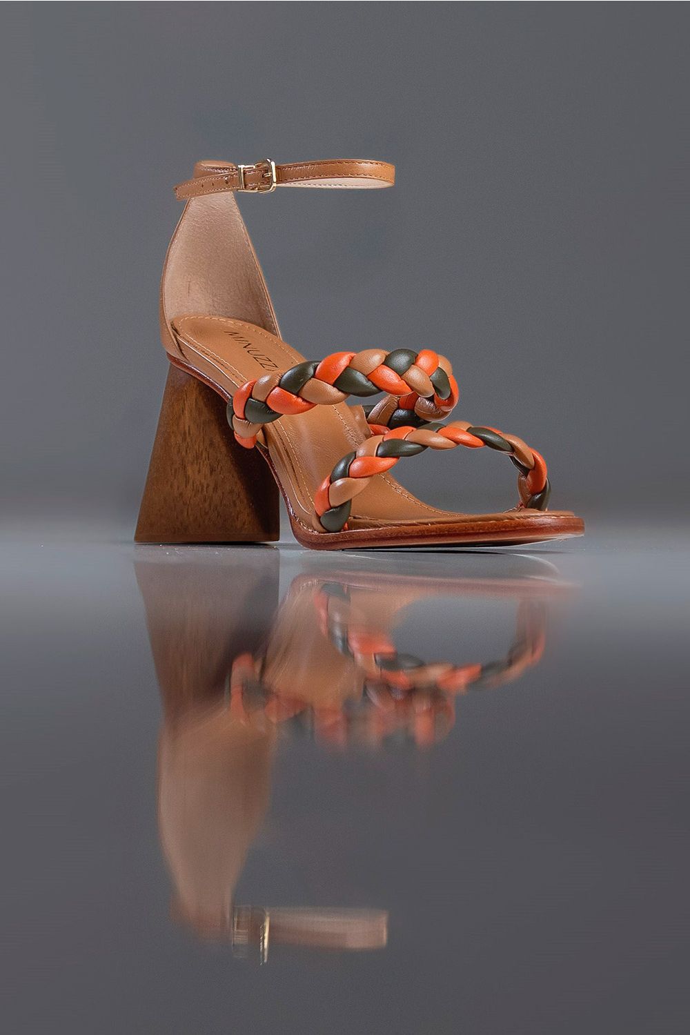 SANDÁLIA MARINA - couro caramelo, laranja e verde musgo/ salto madeira