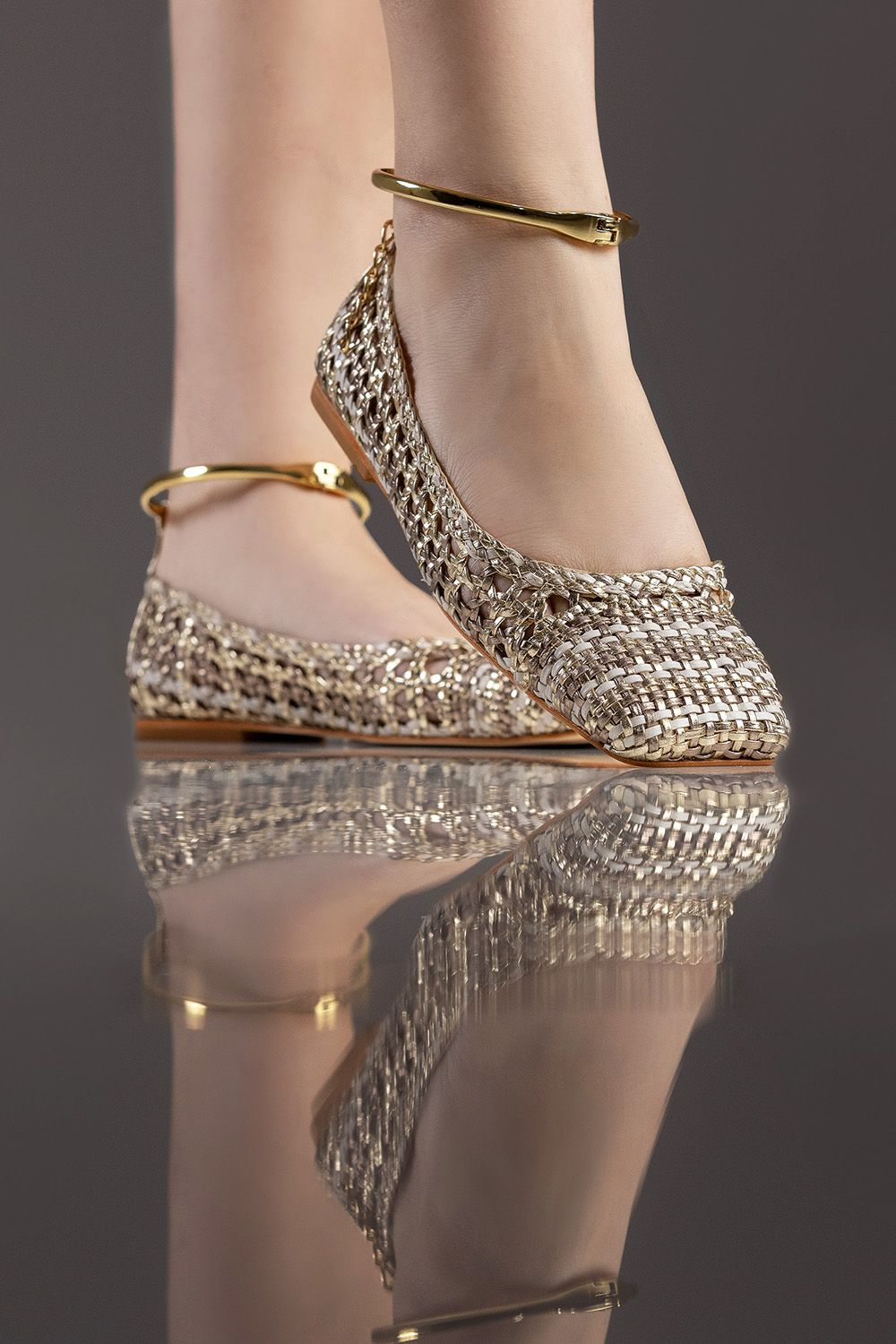 Couro legítimo - cabedal couro champagne, prata velho e off white - técnica tressê/ macramê - tira removível - solado couro natural - acompanha duas pulseiras banhada a ouro.